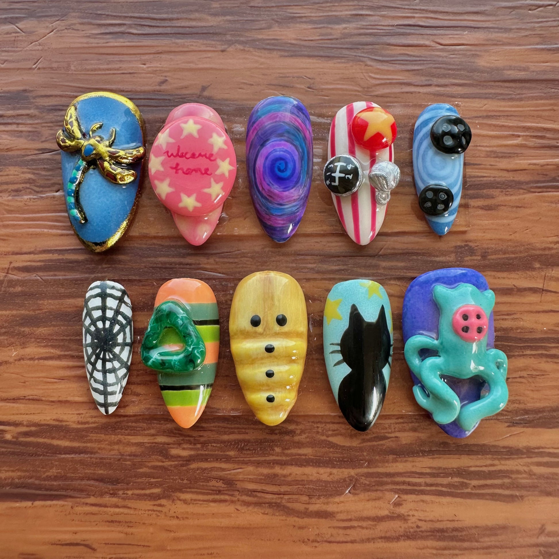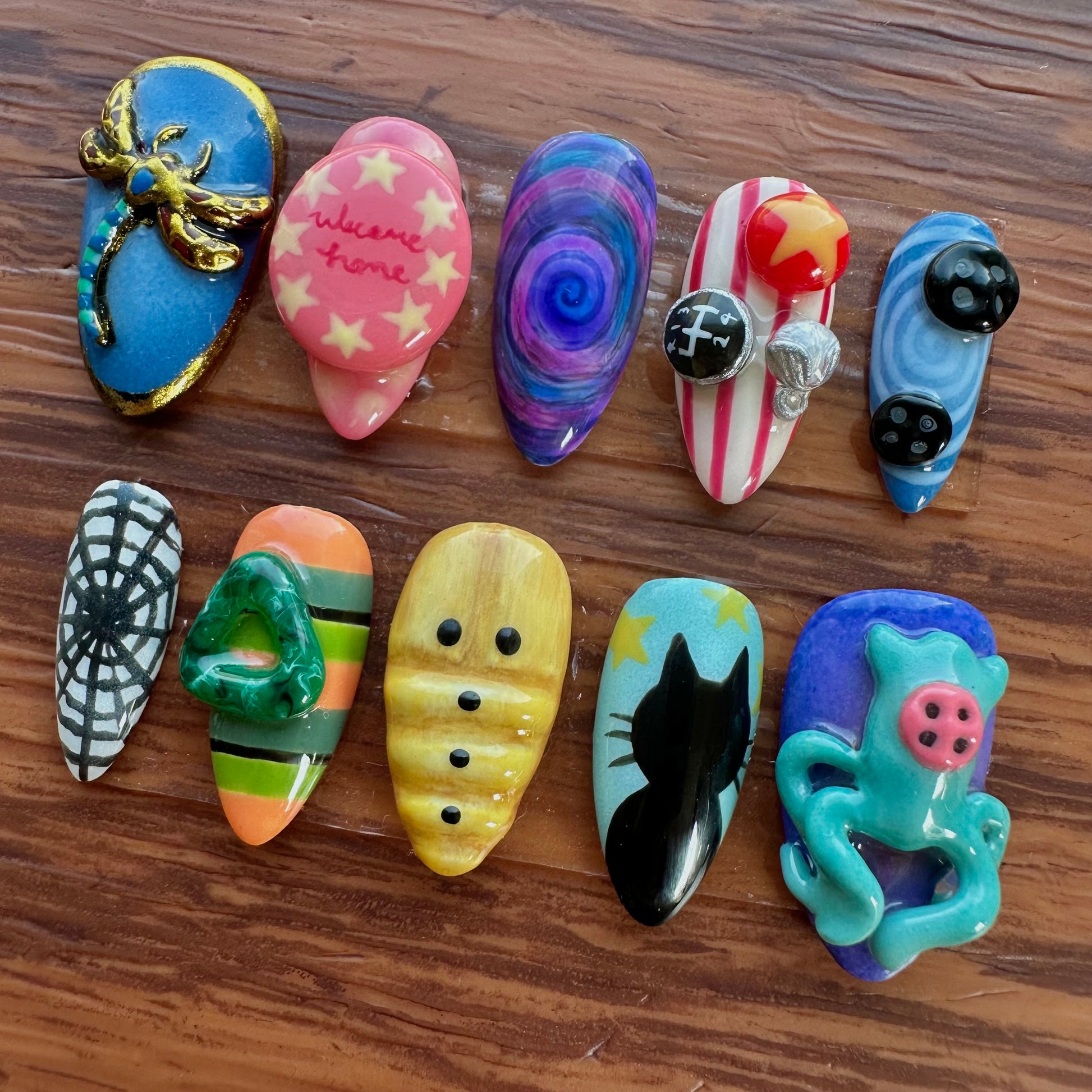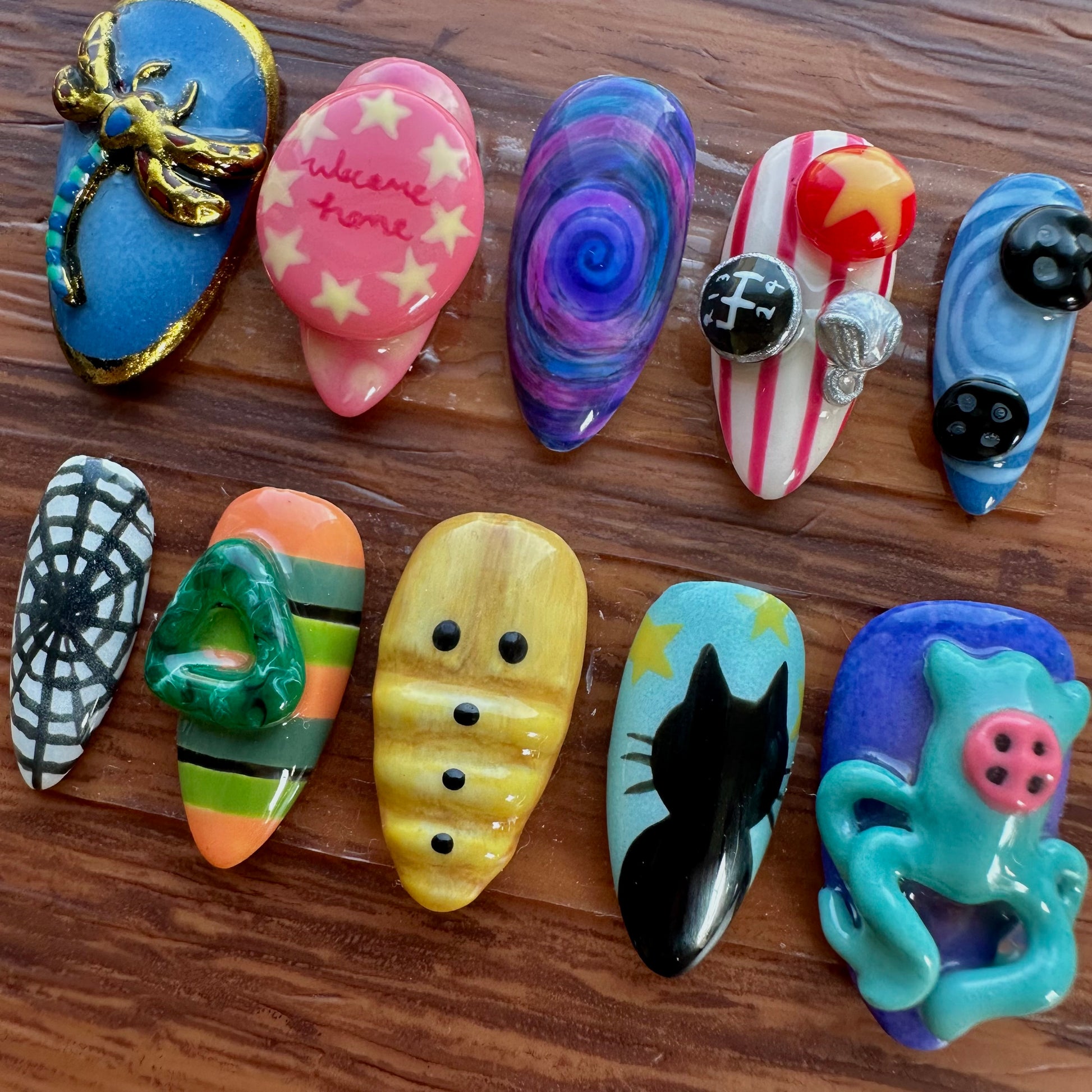 ✰This set includes 10 hand painted nails and a nail prep application kit. The kit includes a wooden cuticle, two alcohol prep pads, a mini buffer and nail glue.