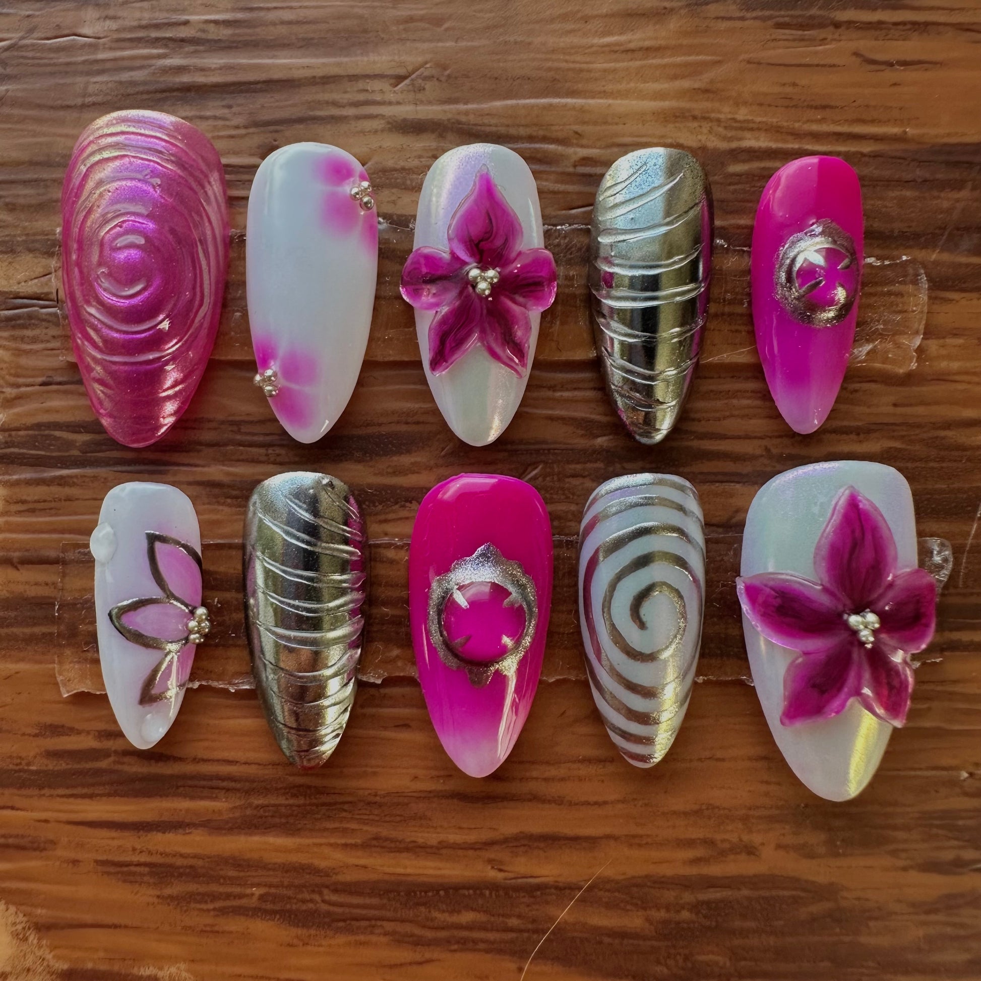 ✰This set includes 10 hand painted nails and a nail prep application kit. The kit includes a wooden cuticle, two alcohol prep pads, a mini buffer and nail glue.