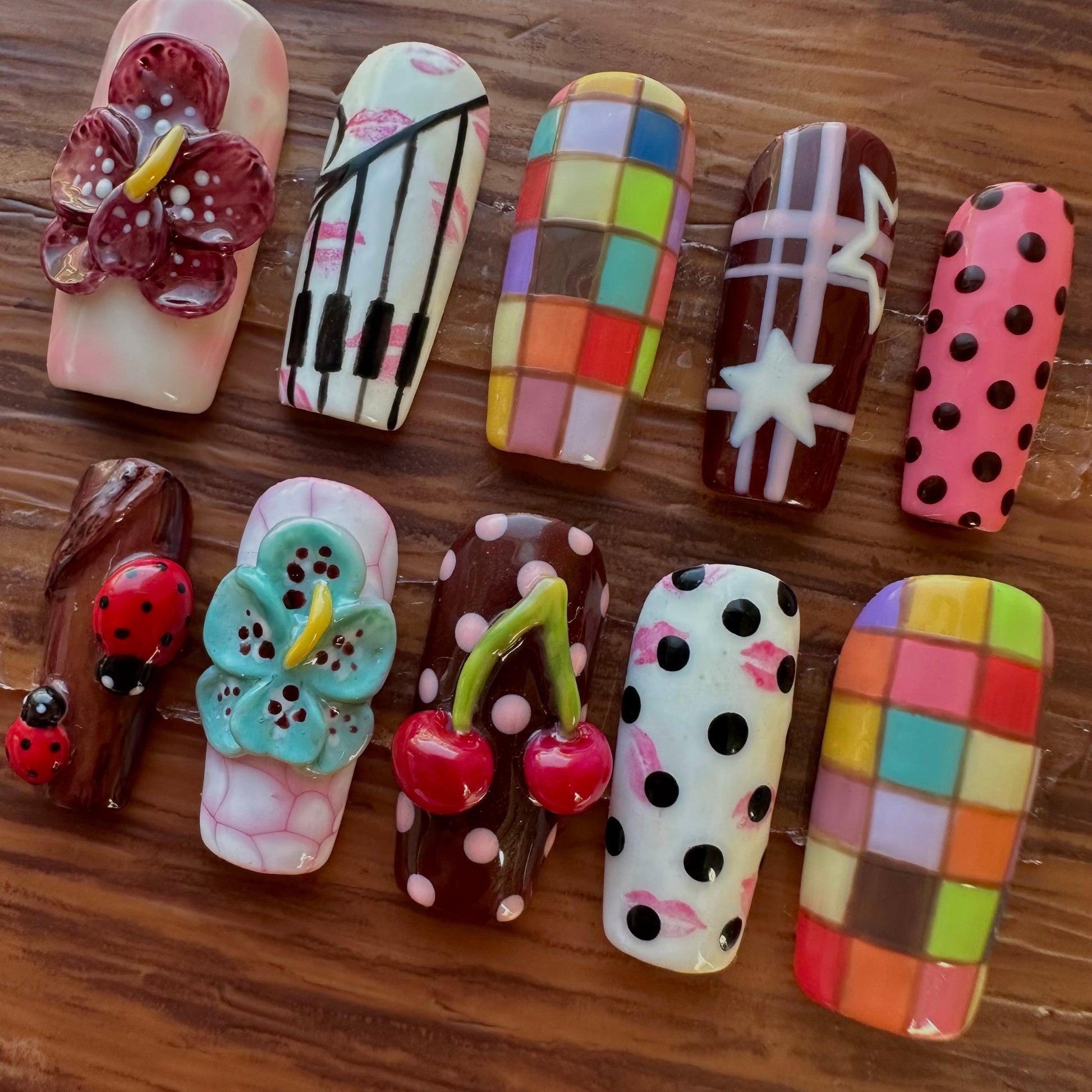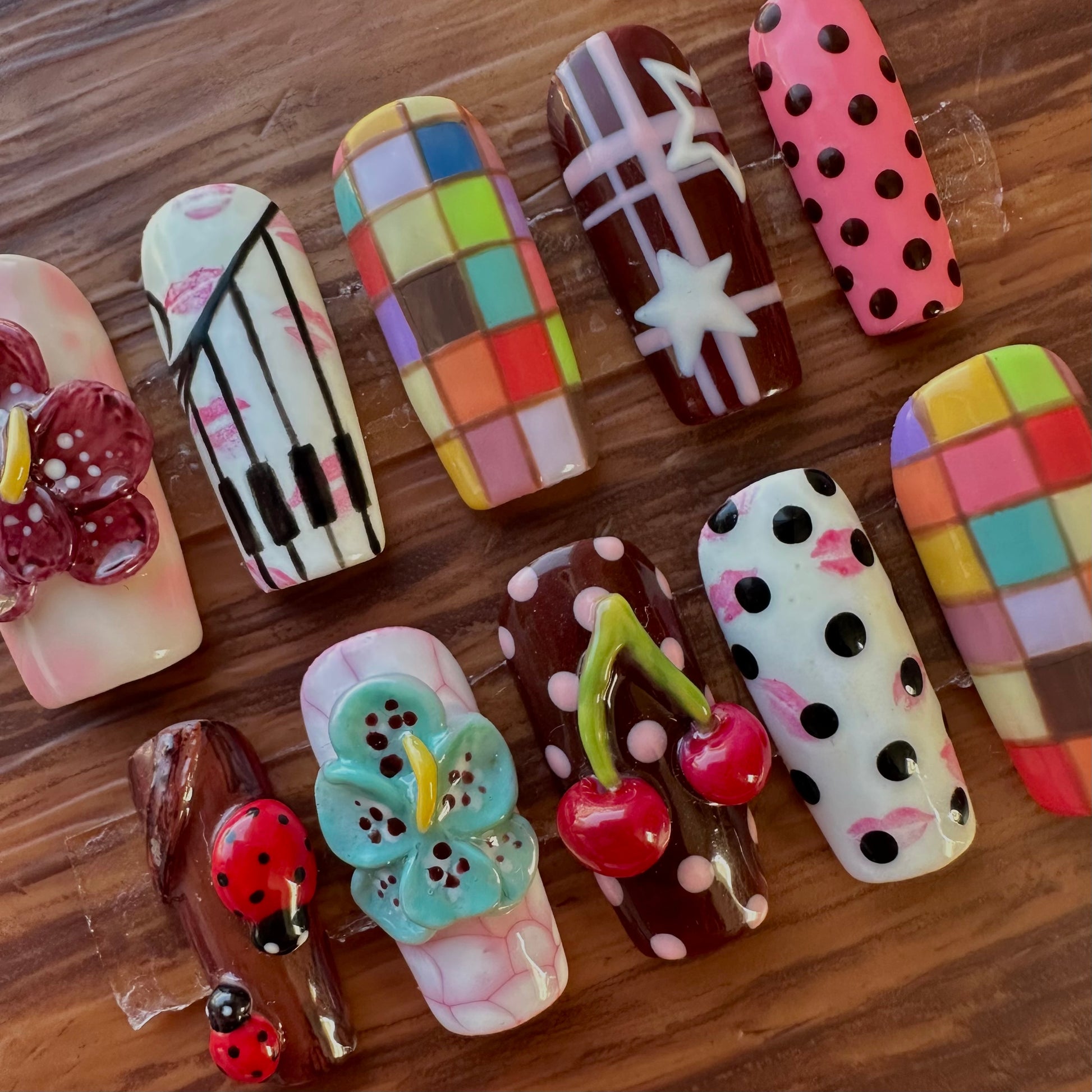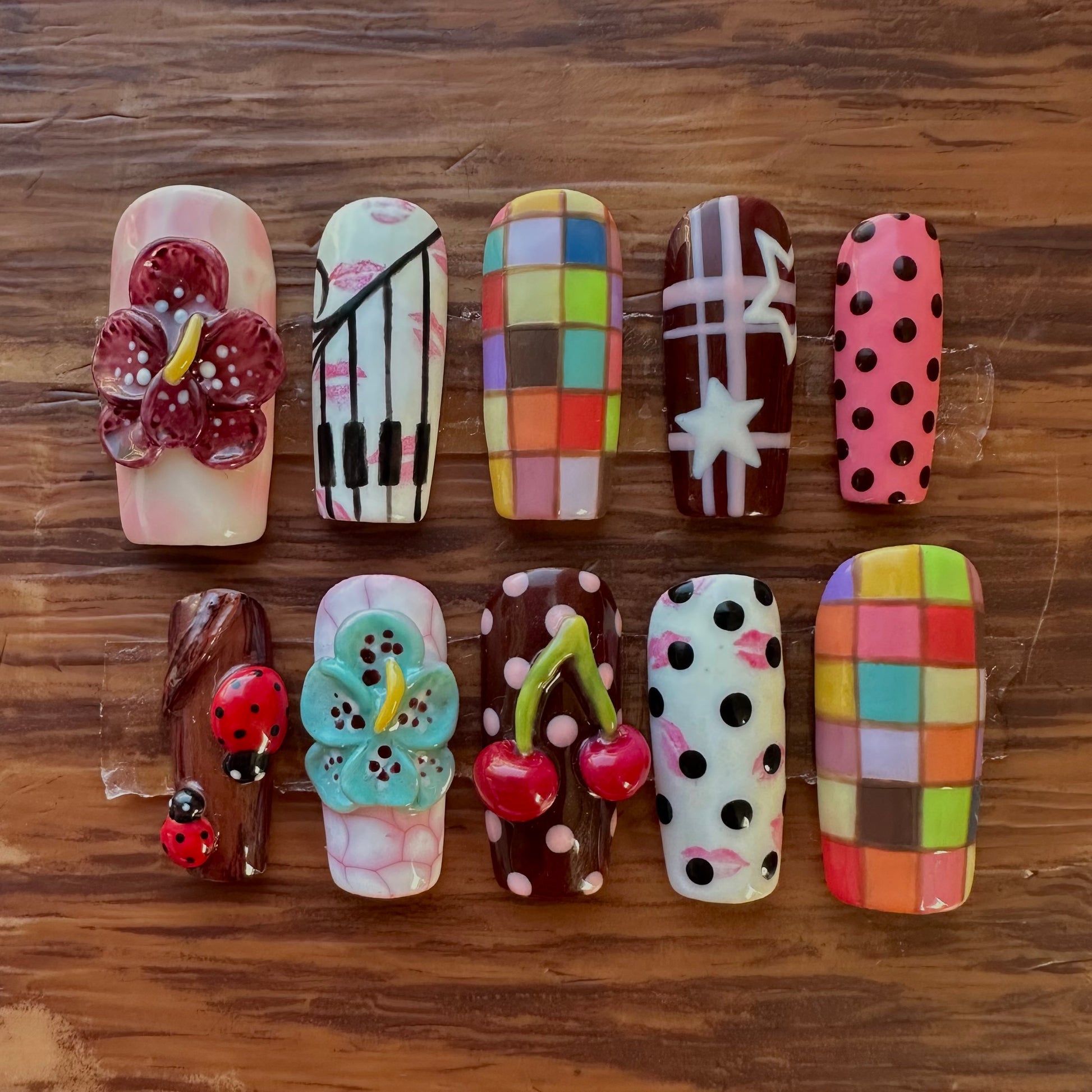 ✰This set includes 10 hand painted nails and a nail prep application kit. The kit includes a wooden cuticle, two alcohol prep pads, a mini buffer and nail glue.
